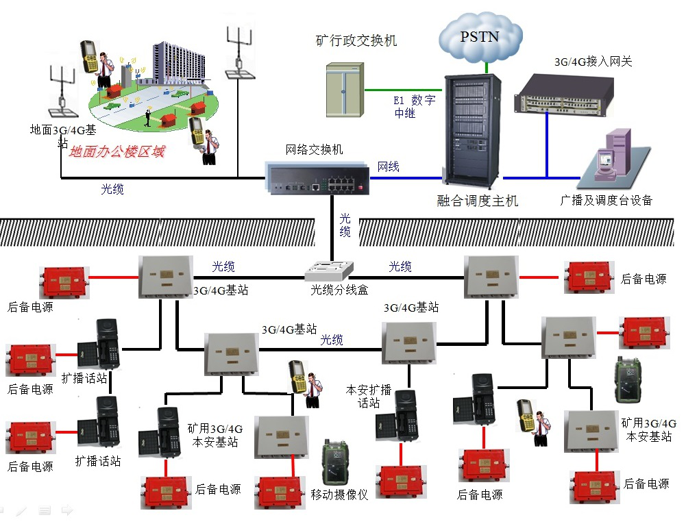 矿用无线通信系统是基于3G/4G技术和设备为基础的矿用移动通信系统。为井下专用移动通信网。该系统为地面一套核心管理设备,在系统覆盖范围内,用户之间可以自由通讯,实现井下通讯。